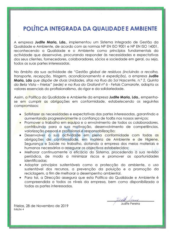 Reconhecemos que é na Qualidade e no Ambiente que está o foco da actividade de gestão de resíduos. Deste modo, a da empresa Judite Maria, Lda., empenha-se em cumprir as obrigações em conformidade, assumindo os compromissos presentes na nossa Política Integrada da Qualidade e Ambiente. |